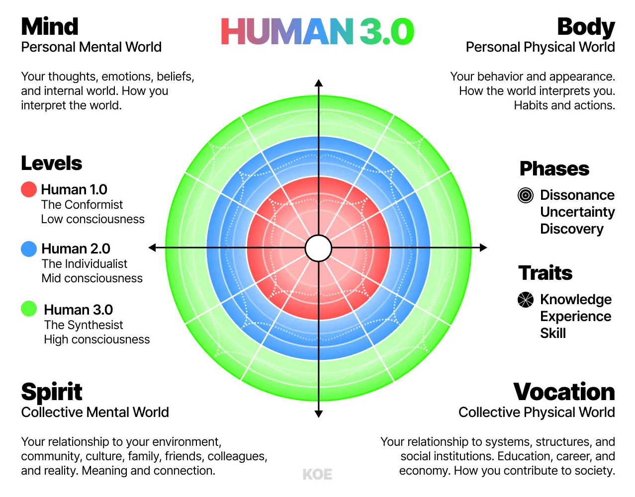 在 HUMAN 3.0 中,我将人类发展描绘在四个基本维度(心智、身体、精神、职业)上。