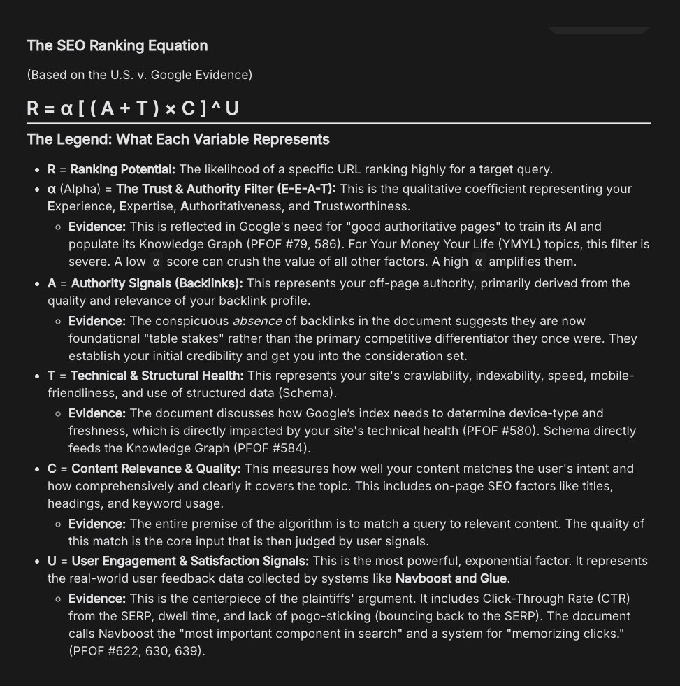 这张图片展示了基于美国司法部对谷歌(U.S. v. Google)反垄断案证据所总结出的 “SEO 排名方程式”(The SEO Ranking Equation)。这个公式试图量化一个特定 URL 在目标搜索查询中排名较高的可能性。